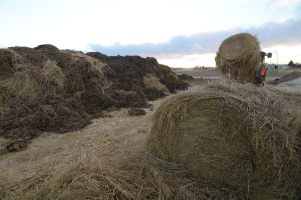 牛糞、稲わら、もみ殻を積んで、発酵を進めます。