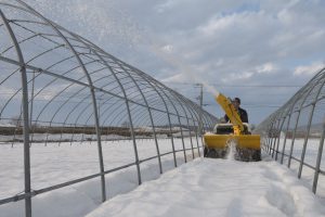 育苗ハウスにビニールを掛けるためのハウス周りの除雪です。