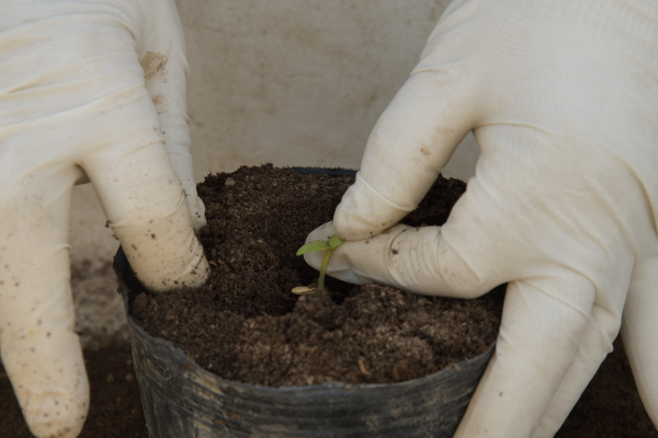 芽が出たメロンの苗を、これから一ヶ月育てるための鉢に植え替えた。
