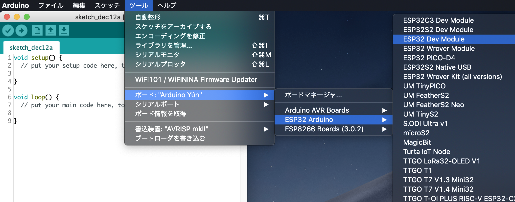 インストールが終わったら、「ツール」からボードの設定を行います。