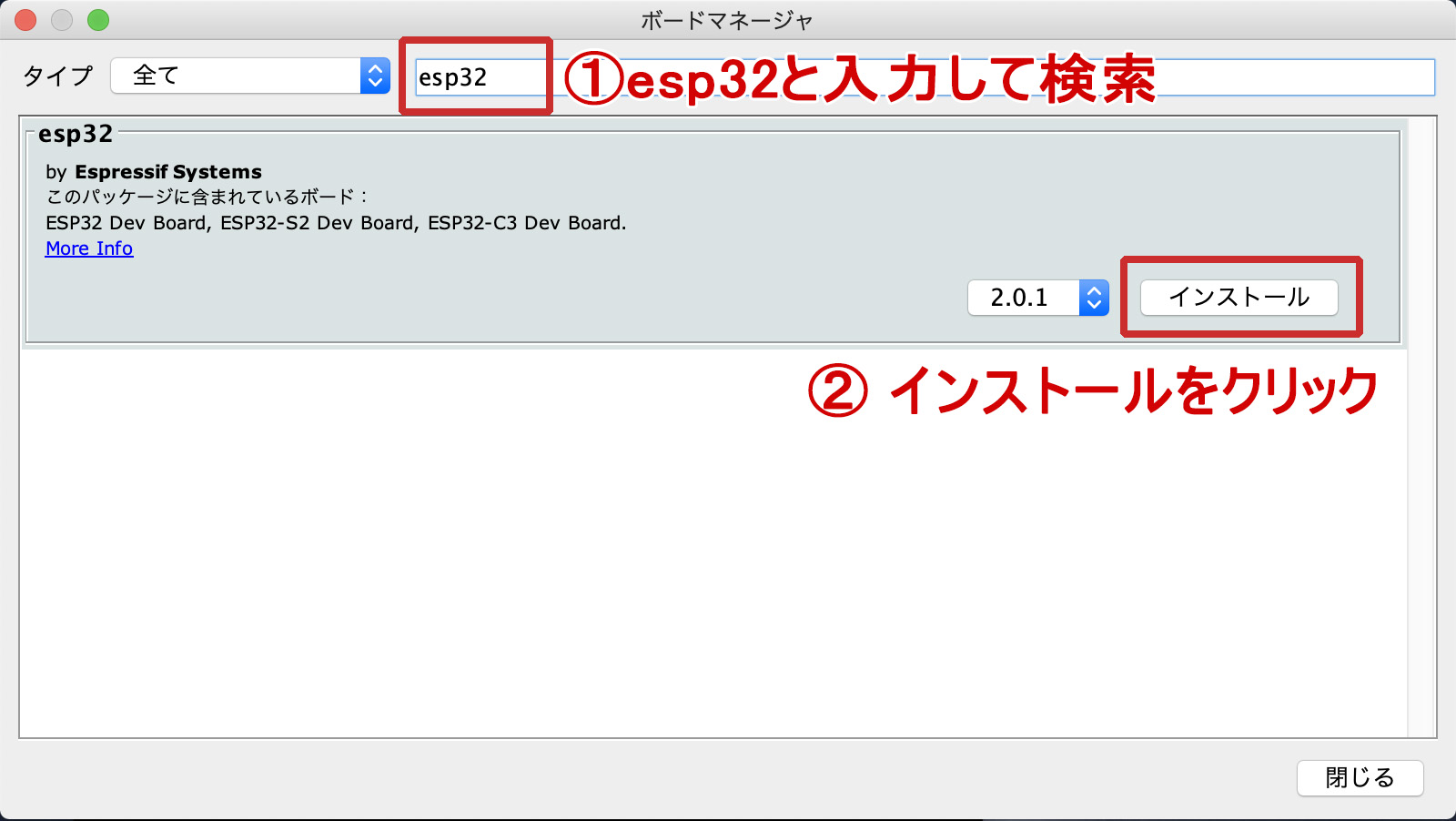 検索をフィルタに…に「esp32」と入力すると「esp32 by Espressif Systems」がでてきますので、インストールします。
