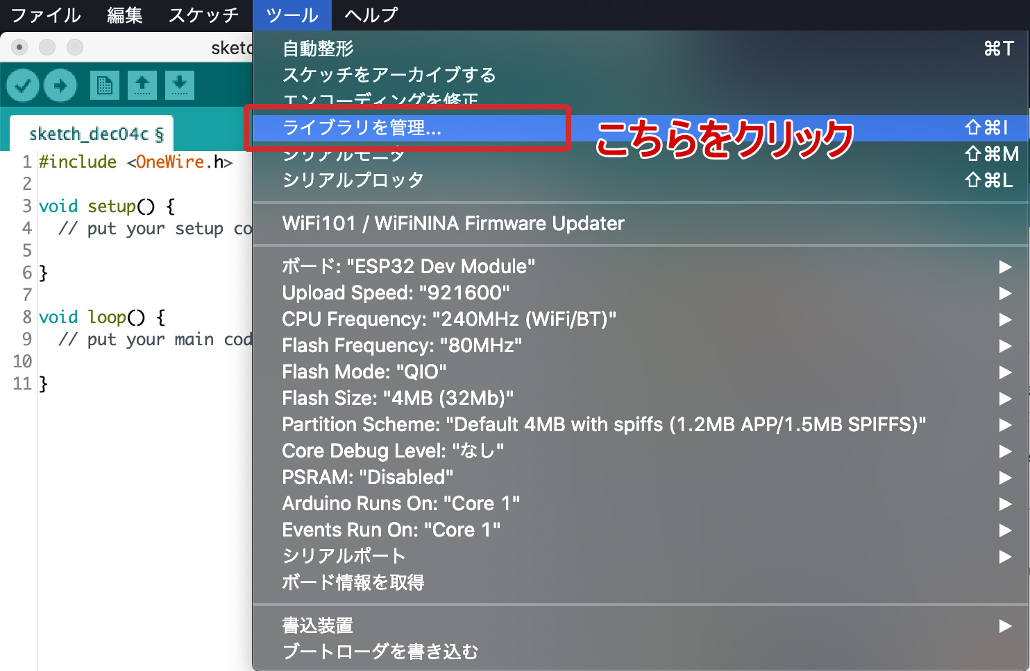 ※ スケッチがコンパイル出来ない場合は、バージョン1.0.6をインストールして下さい。