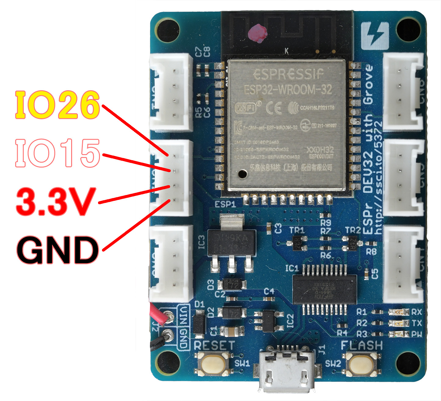 今回はESPr® Branch 32(Groveコネクタ付き)の写真のポートに接続します。