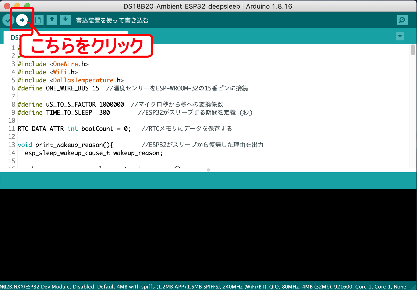 ArudinoIDEの矢印アイコンを押すと、書き込みが始まります。