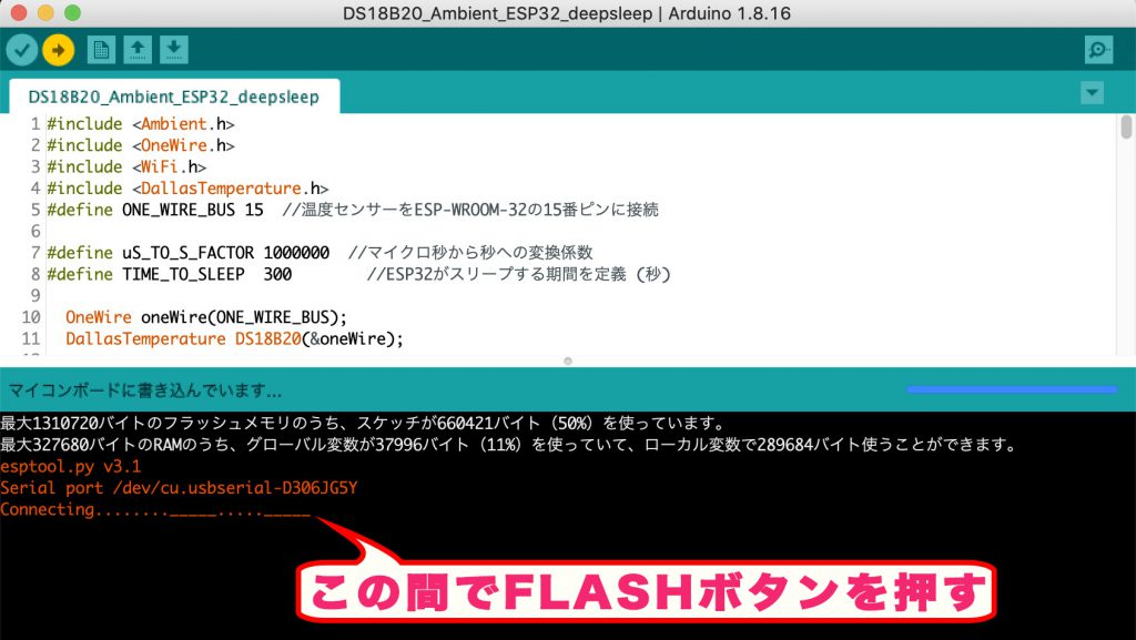 Connecting….._ _ _ _ _…… となったところでFLASHボタンを押すと書き込みが始まります。
