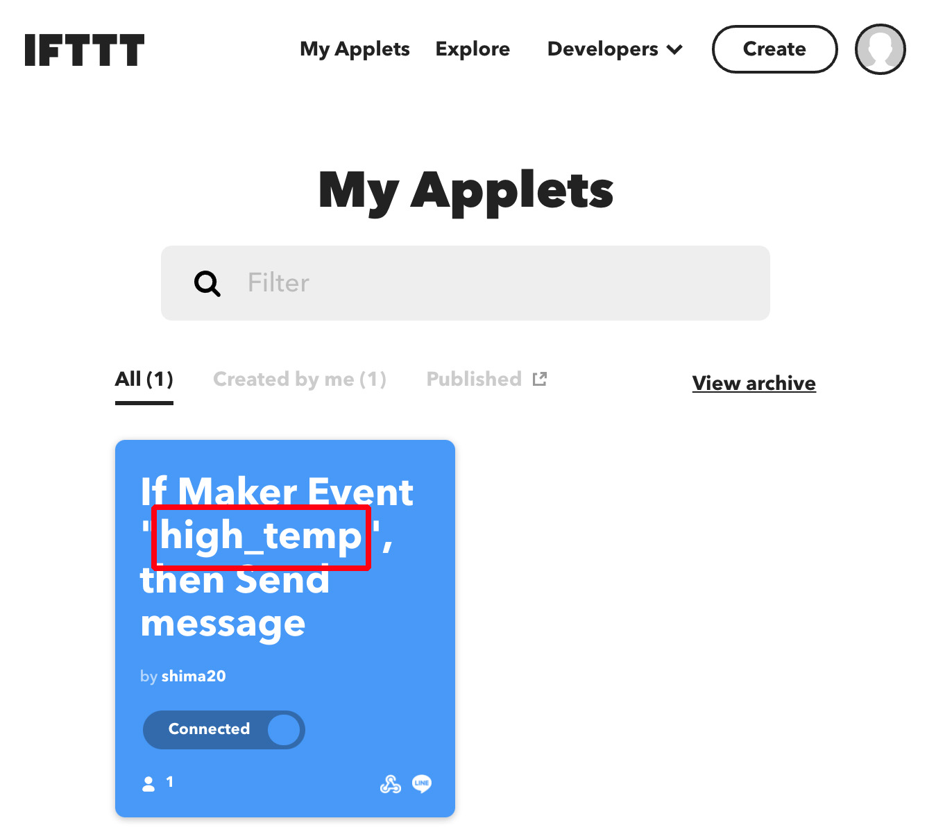 - 設定温度を超える温度になった時、プラットフォームを連携させるWebサービス「IFTTT」を介してLINEに通知するための設定。